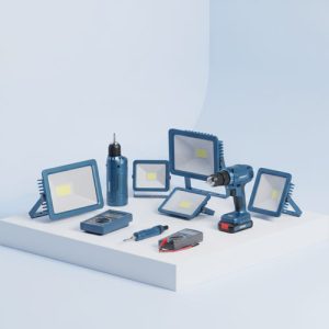مجموعهای از روشنایی، ابزار و لوازم برقی کاربردی روزمره.