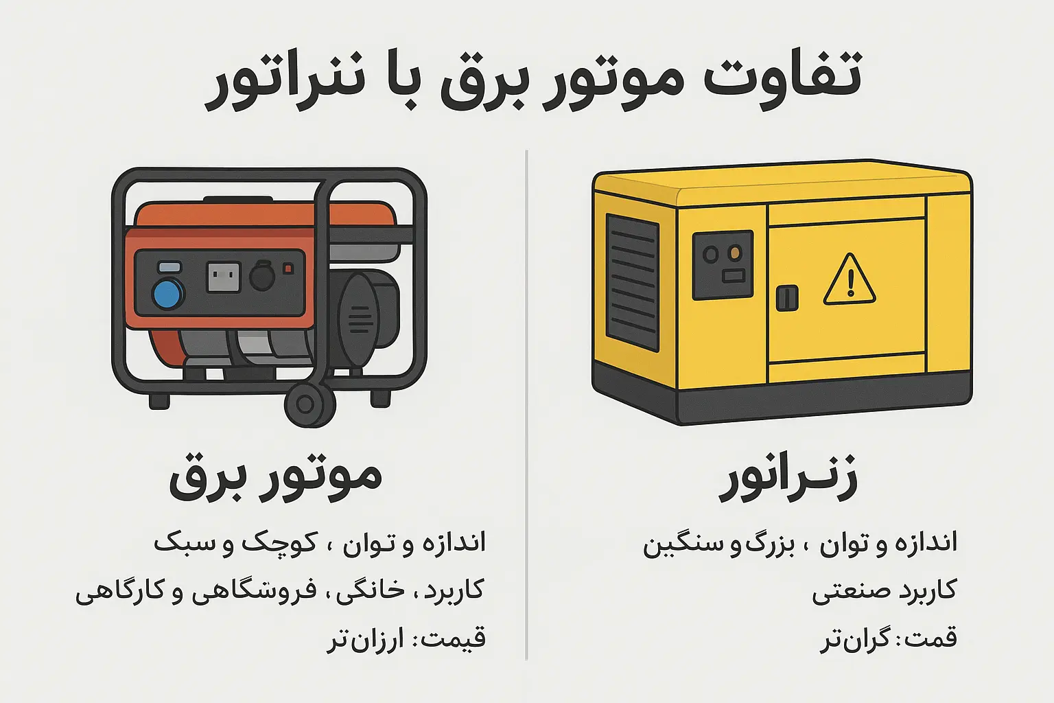 اگرچه خیلیها موتور برق و ژنراتور را یکی میدانند، اما تفاوتهای اساسی بین آنها وجود دارد. موتور برق دستگاهی کوچک، پرکاربرد و قابلحمل است که بیشتر در مصارف خانگی و نیمهصنعتی کاربرد دارد، در حالی که ژنراتور دستگاهی قدرتمندتر و بزرگتر است که در صنایع و مراکز بزرگ استفاده میشود.